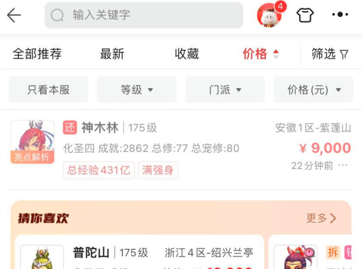 不知道各位玩家是否在意过化圣角色的价格呀,上面就是最近在藏宝阁上成交了一个175级化圣4层的角色的价格,该角色的价格已经到了9000,上架之后就直接被别人给瞬秒了,一个化圣寺的角色都降到9000了,那么刚刚化圣的角色的价格不得到9000以下呀。看来梦幻西游中角色的底子是真的不值钱了。所以各位玩家也没有必要在游戏中养号了,因为养号是需要很长的时间的,如果各位玩家买一个买底子的角色,然后再在游戏中刷相同的时间用满底子的角色刷钱,用满底子的角色刷出来的那些收益,早就可以抵得上购买角色的成本了。